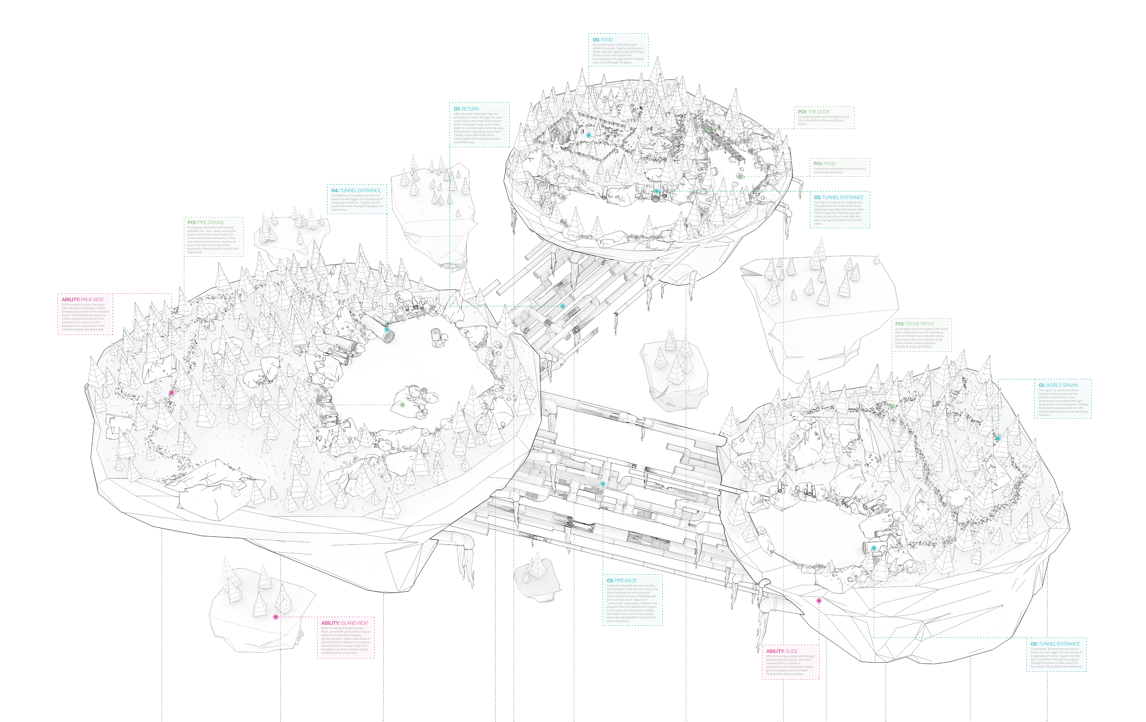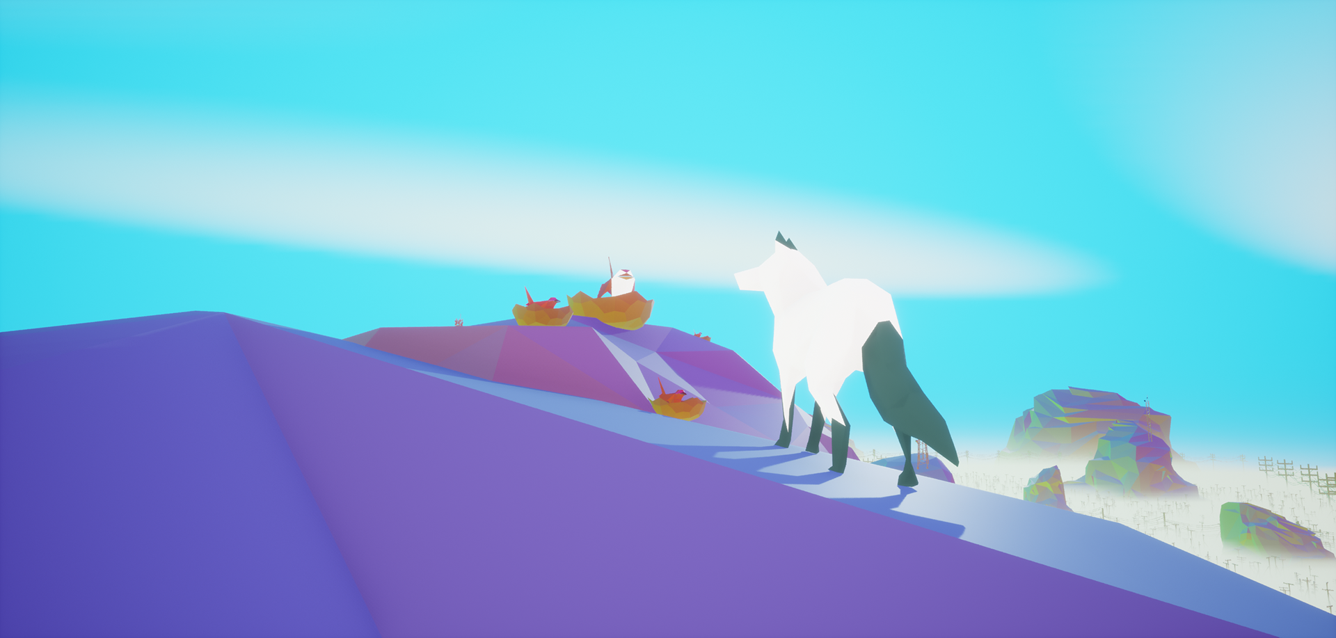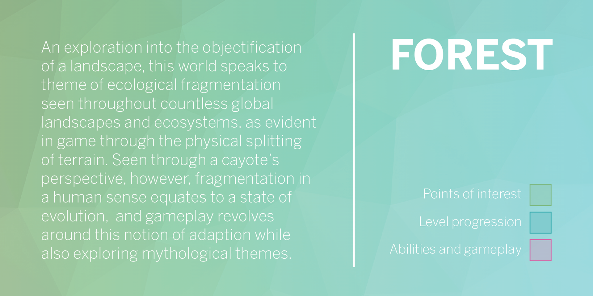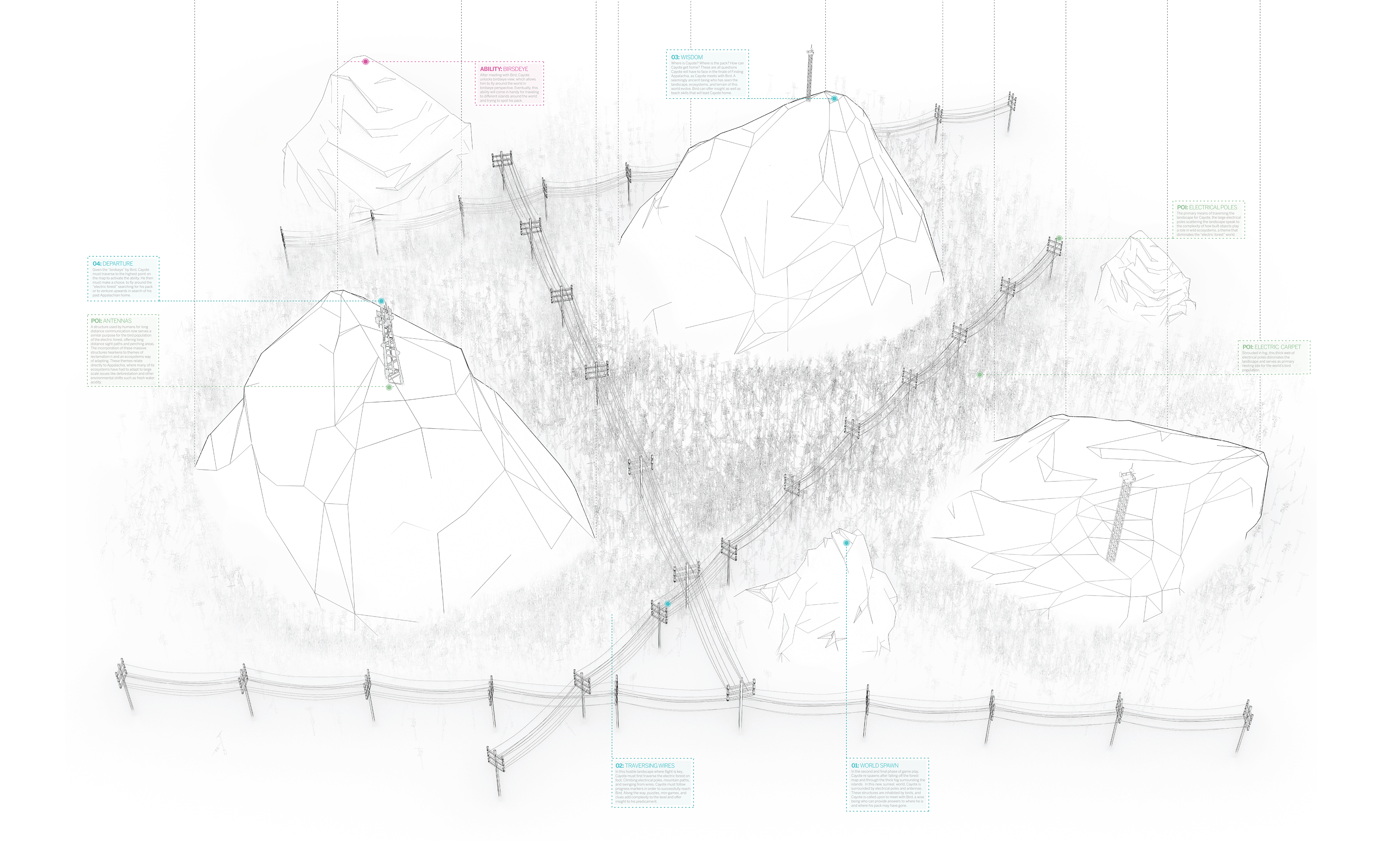 Finding Appalachia is a game world set within a low-poly abstraction of modern Appalachia. In a story of companionship, loss, and discovery/realization, the game follows Cayote and his pack through surreal, yet familiar landscapes and places. An abrupt separation of Cayote and his pack leads Cayote to wisdom and a new outlook towards his home.